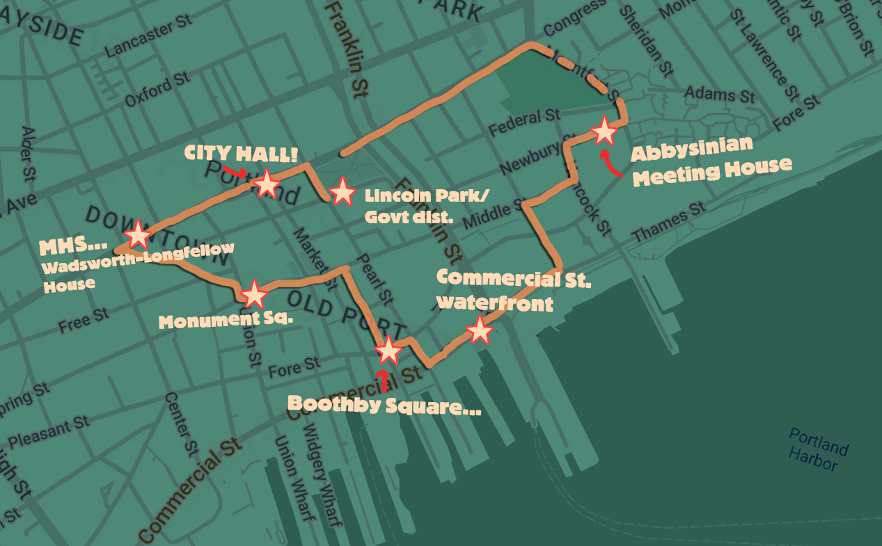 Our route begins at the southern corner of Lincoln Park, on Congress Street. From there, we’ll head up Munjoy Hill to Eastern Cemetery, before turning back toward the Old Port. We’ll take in some of the most historic parts of Portland’s old trading district, and then move to Monument Square, the city’s de facto central plaza. Our journey ends with a walk by the famed city hall, before returning to Lincoln Park.